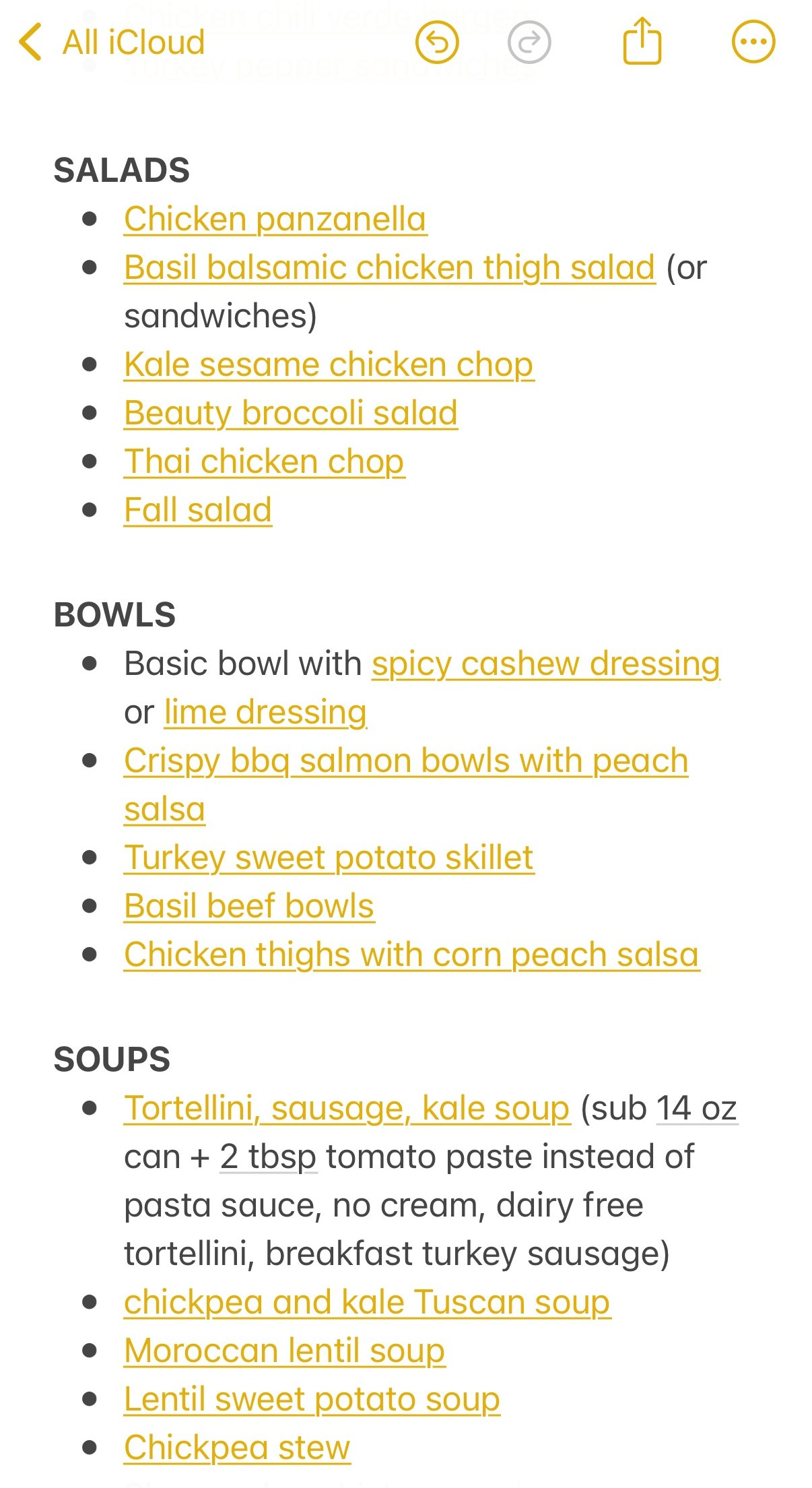 Meals: Every home-cooked meal my family enjoys, categorized by cuisine, with hyperlinks or references to the recipe origin, for quick reference when meal planning